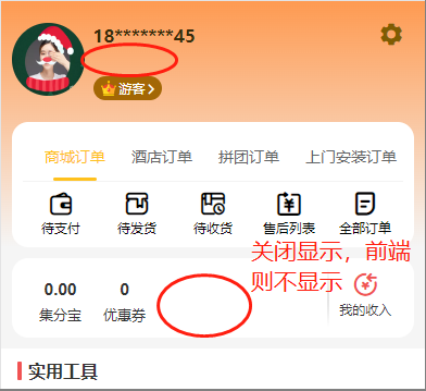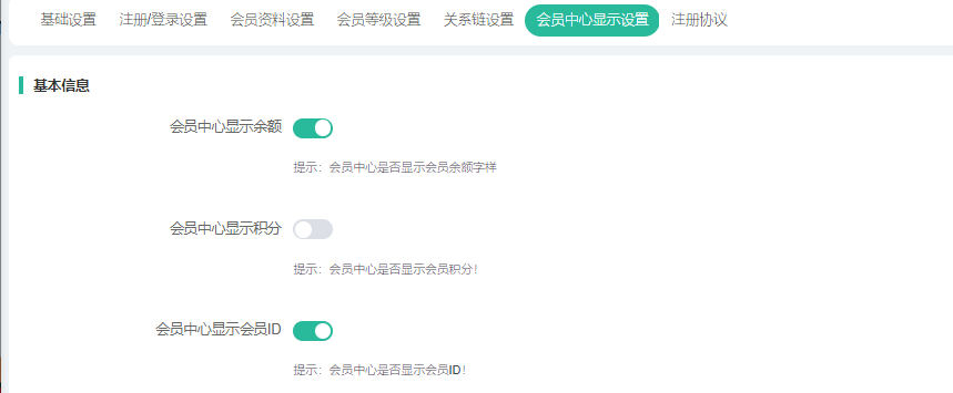 会员中心显示余额/积分/会员ID:开启就显示。仅针对系统默认页面,即不开启页面装修的情况下,才会隐藏.