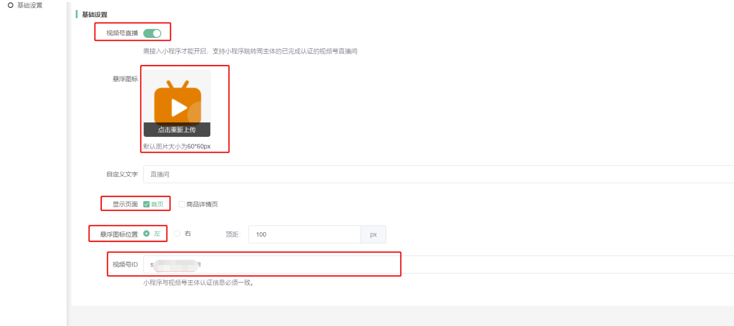 1.后台--系统--应用进入视频号直播间插件,基础设置中可设置视频号直播间的悬浮窗口在首页和商品详情页面显示、自定义悬浮图标图片、自定义文字、悬浮图标位置
