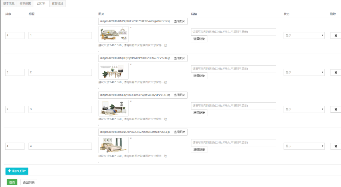 ③ *套餐商品:需要先添加套餐商品栏目,例如栏目1:客厅,然后选择该栏目的商品,