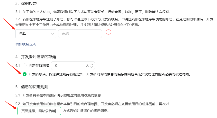 注意:部分小程序没有直接显示全部要填写的隐私内容,可以点击 “增加消息类型” 勾选对应类型填写好内容,小程序隐私协议比较严格,如有使用到的需要增加上,建议按照教程所需的进行增加。
