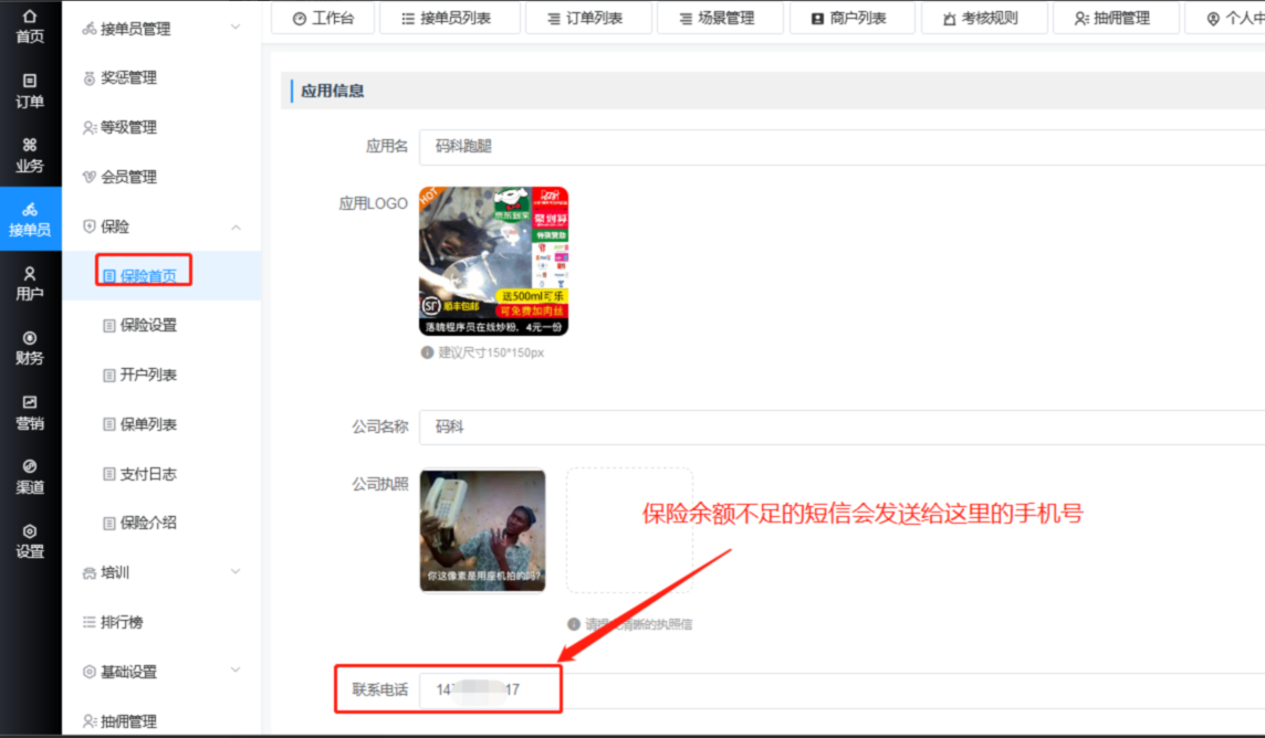 说明:该短信是发送到跑腿平台负责人的手机号,该手机号设置的地方如下图所示。