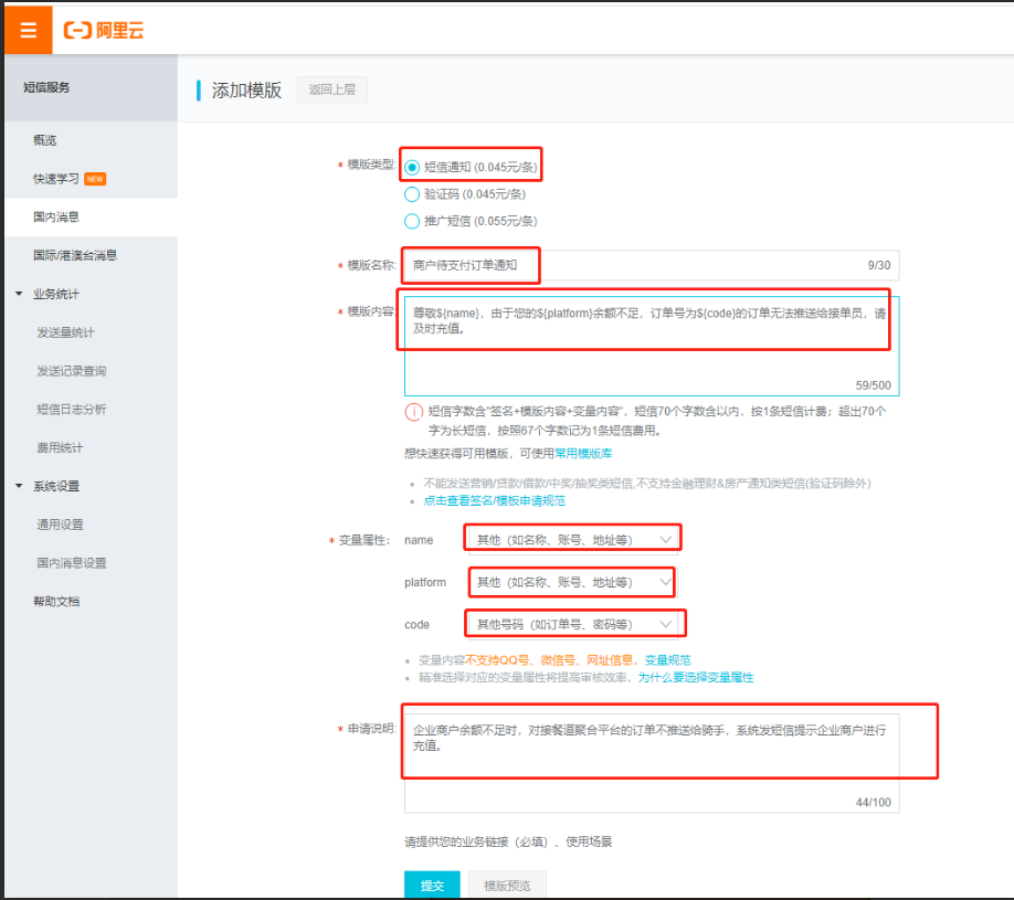 模板内容示例:尊敬${name},由于您的${platform}余额不足,订单号为${code}的订单无法推送给接单员,请及时充值。