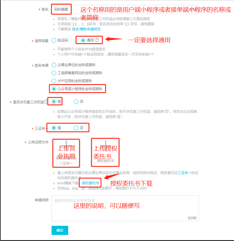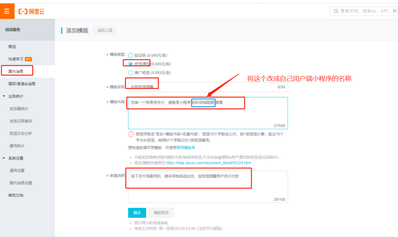 注意:如果是新申请的用户端或者接单端小程序,那么要在小程序发布之后,再到阿里云后台添加短信签名,否则阿里云检测不到这个小程序,从而导致申请的短信签名无法通过。