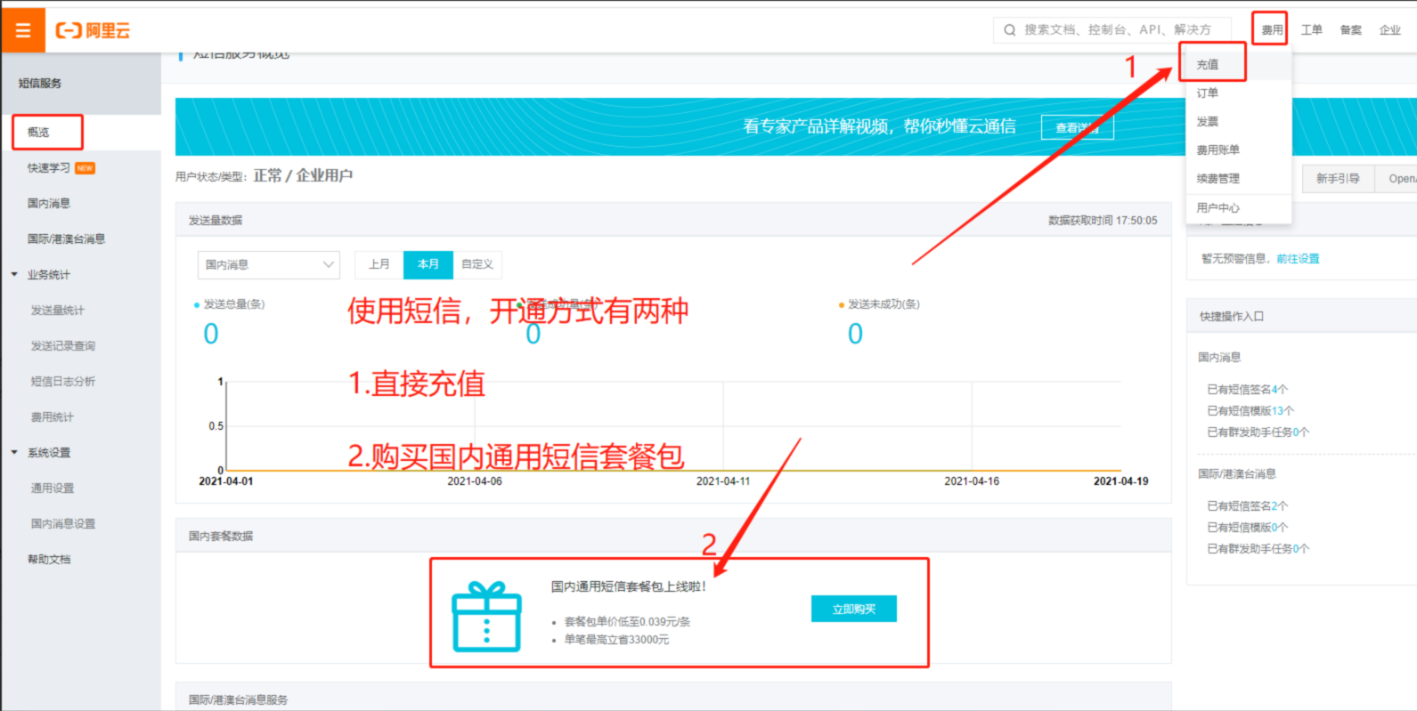 如果已经开通,忽略此步骤。注意:开通的时候,选择“国内短信”