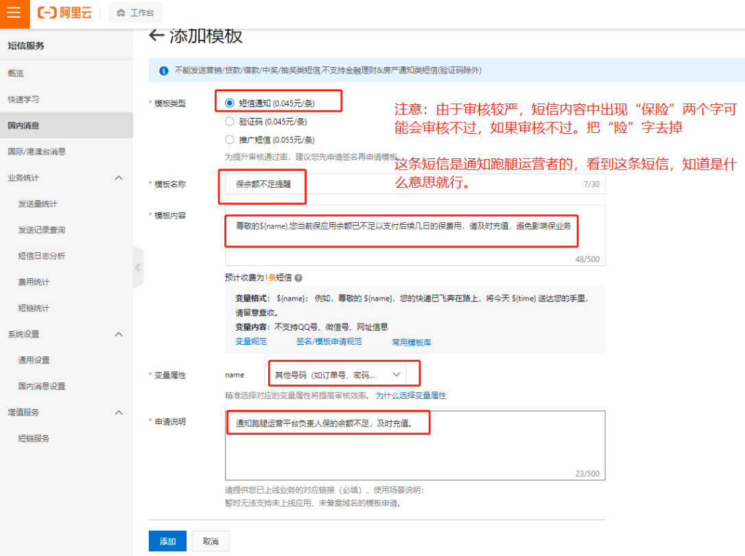 模板内容示例: 尊敬的${name},您当前保应用余额已不足以支付后续几日的保费用,请及时充值,避免影响保业务。