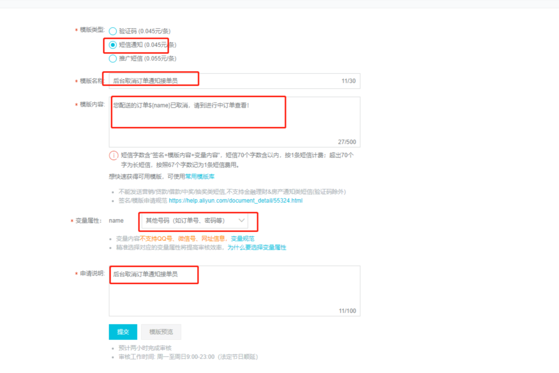 模板内容示例:您的订单${code}已取消,请到我的订单中查看!