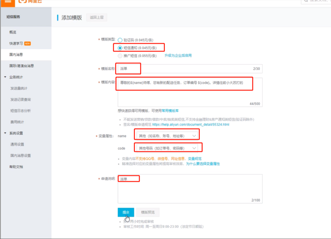 模板内容示例:尊敬的${name}师傅,您有新的配送任务,订单编号 ${code}。详情往前小程序内查看