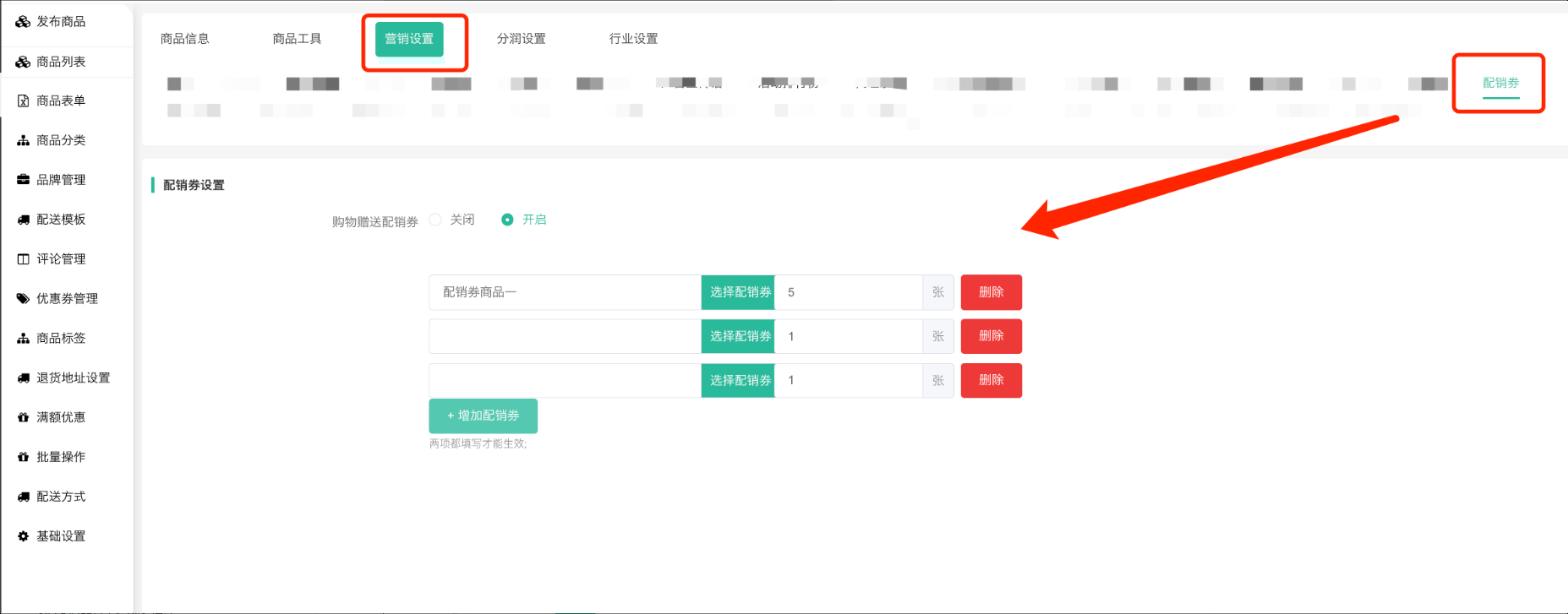 商品编辑--营销设置增加配销券挂件(平台自营、供应商、聚合供应链商品),可设置购物赠送配销券的开关,开启之后,会员下单,系统会根据奖励事件来发放配销券。