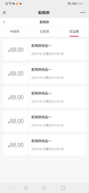 (二)进入显示所有配销券,当前列表的配销券每小时定时执行一次验证配销券是否过期,会员购买商品赠送了已过使用有效期的配销券,也需要过大概一个小时才会变为已过期。不影响下单,下单选择配销券时不能选择不在有效期范围内的配销券