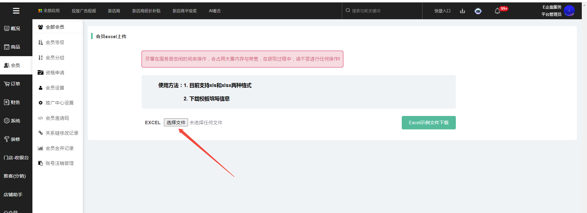 1、第一步,在系统--后台--会员--全部会员--会员EXCEL导入