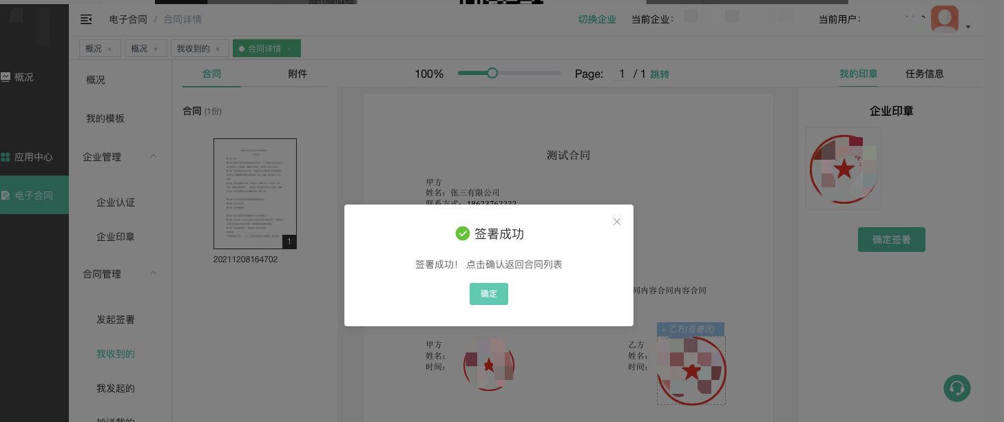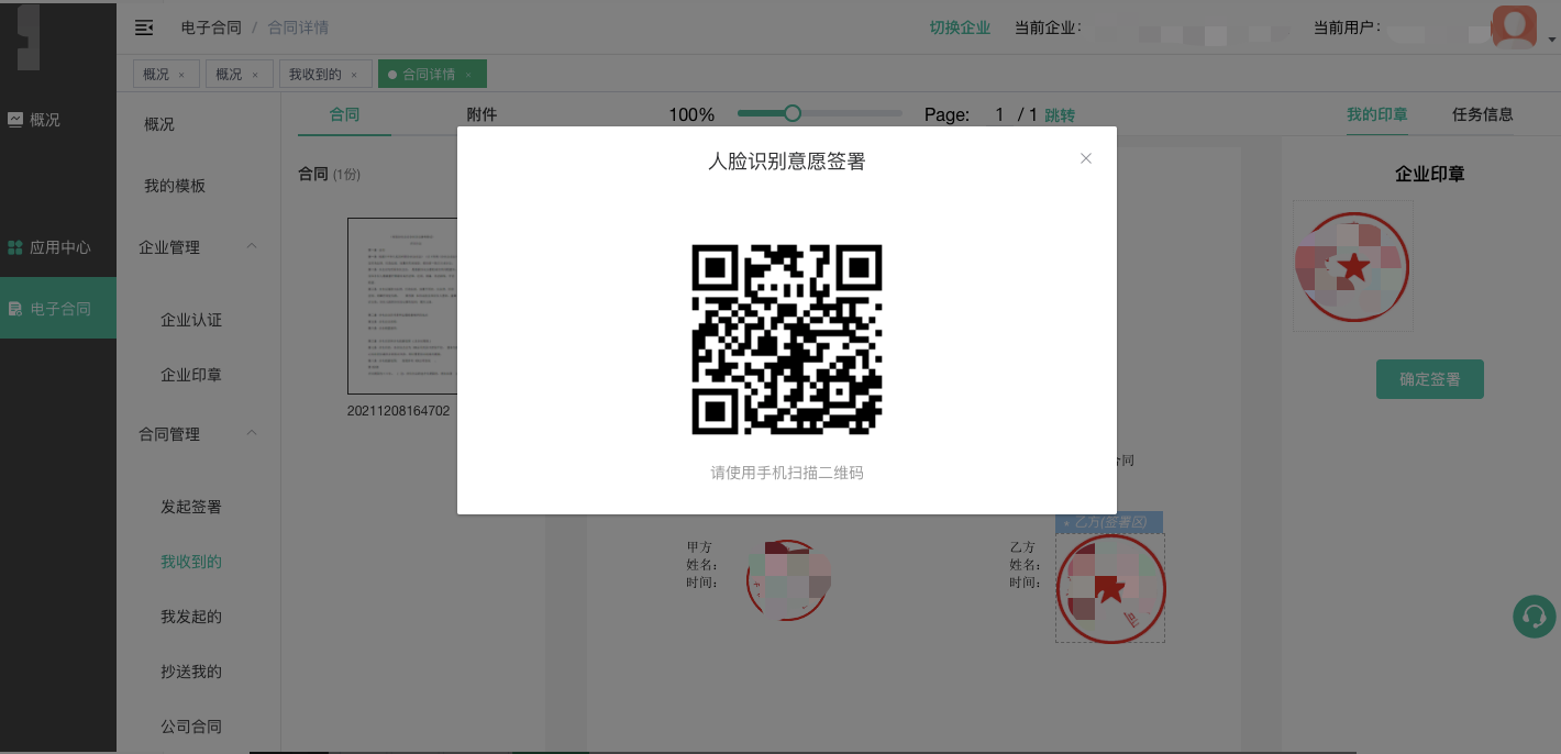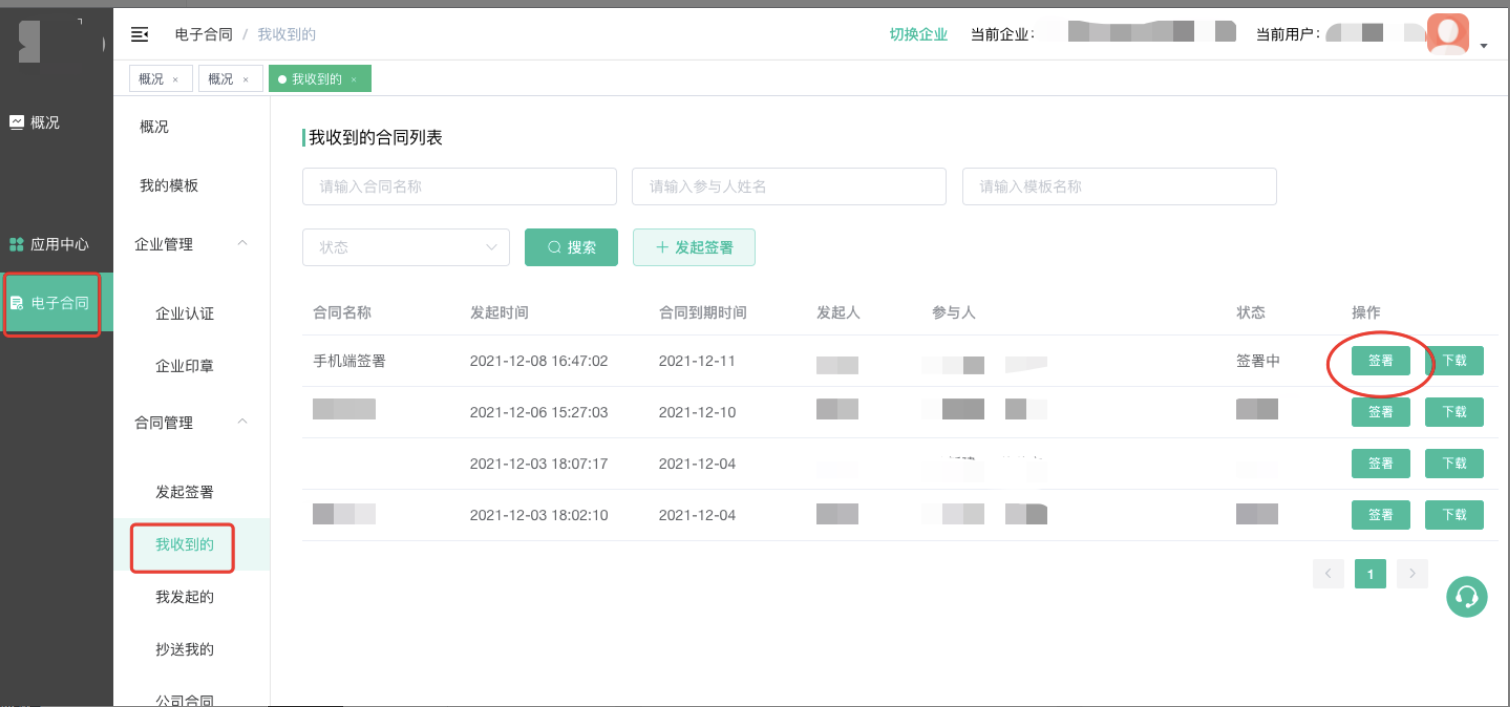 注意:当登录的账户有多企业时,签署合同时要进入合同发起时所填写的空间/企业,如果不确定是哪个,请联系合同发起方确认。
