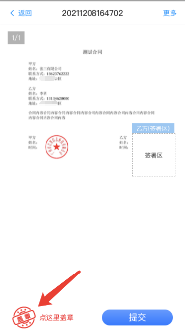 3、浏览合同内容,确认无误后点击左下角【盖章】