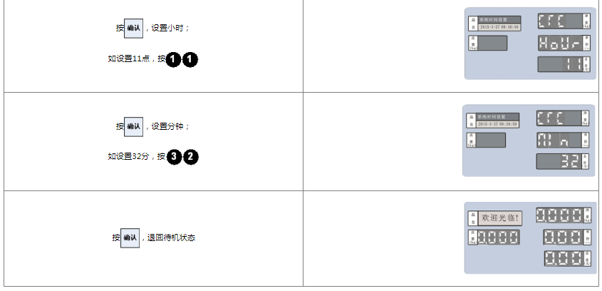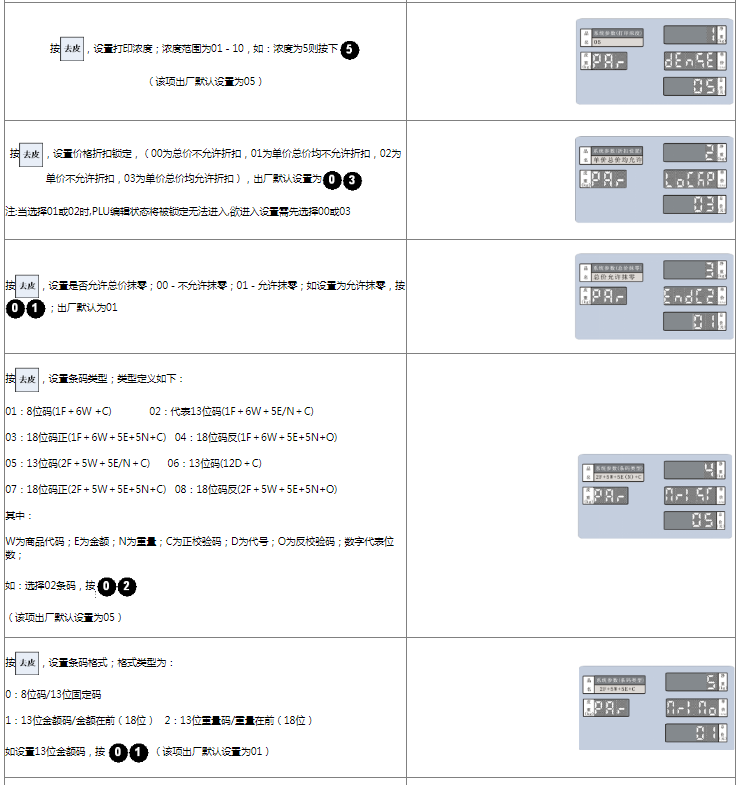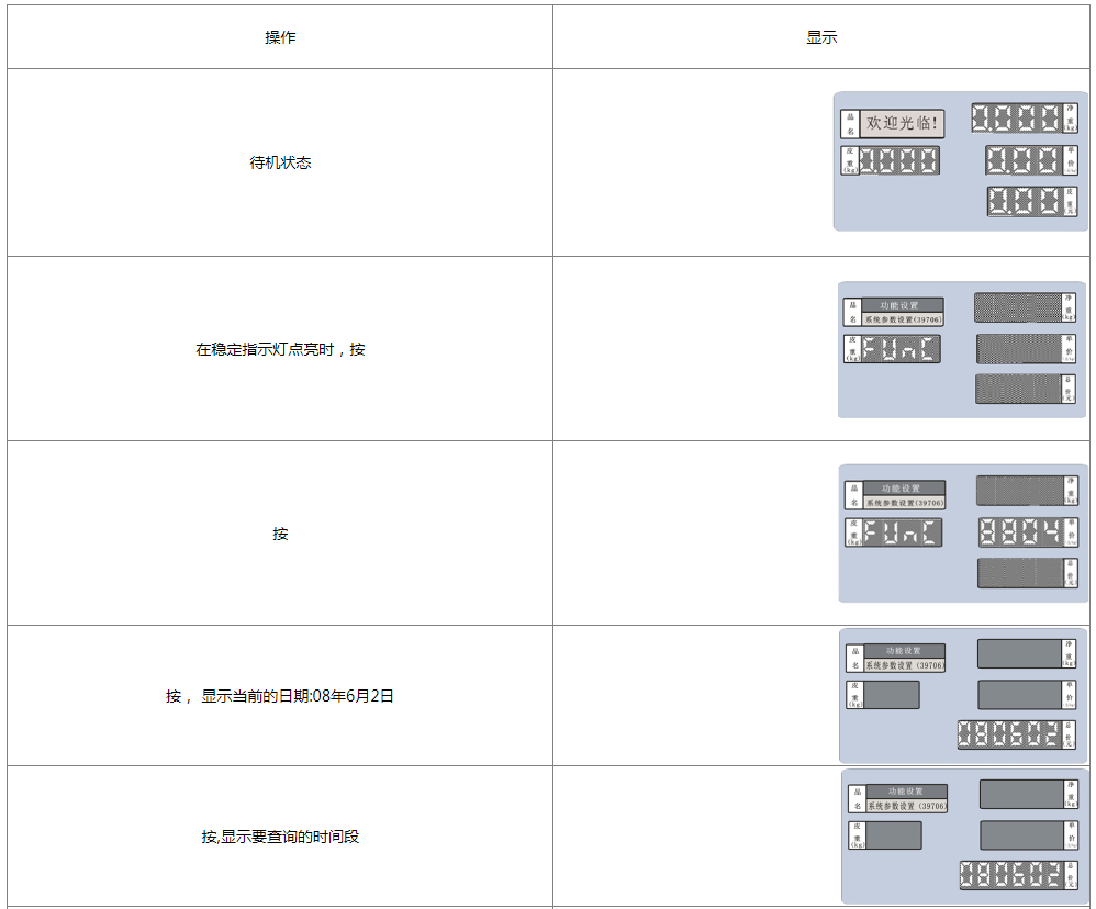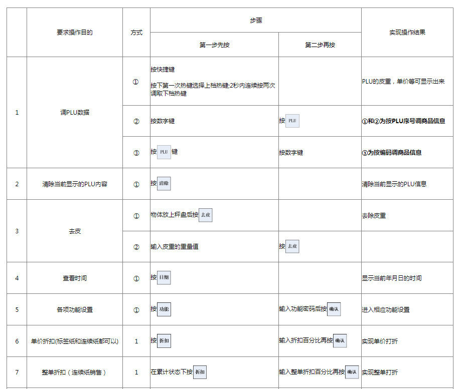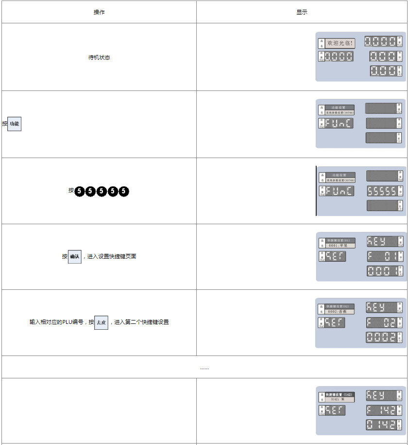 阅读本手册时,操作见表格最左列,表格其余列为实施最左列操作后条码打印计价秤各个窗口的显示内容;