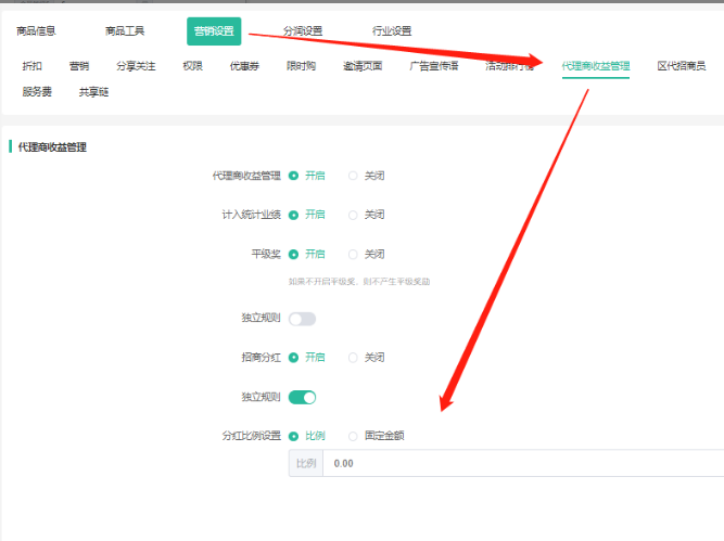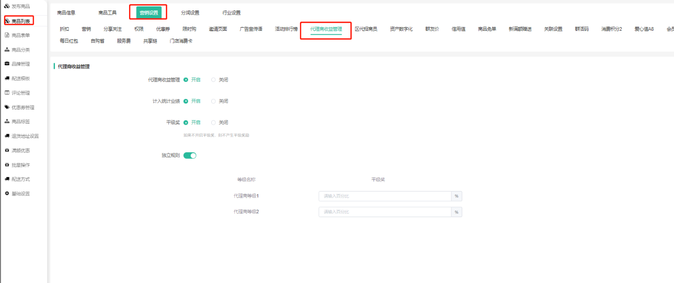 2、商品设置:商品编辑—营销设置—代理商收益挂件:开启后购买商品才会产生差价奖励