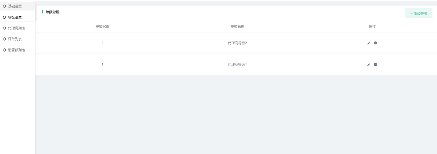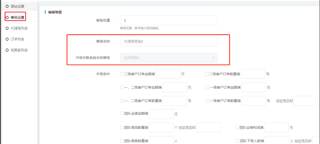 1) 添加代理商等级,设置等级权重、等级名称,关联会员等级;设置升级条件(和经销商管理插件升级条件一致)