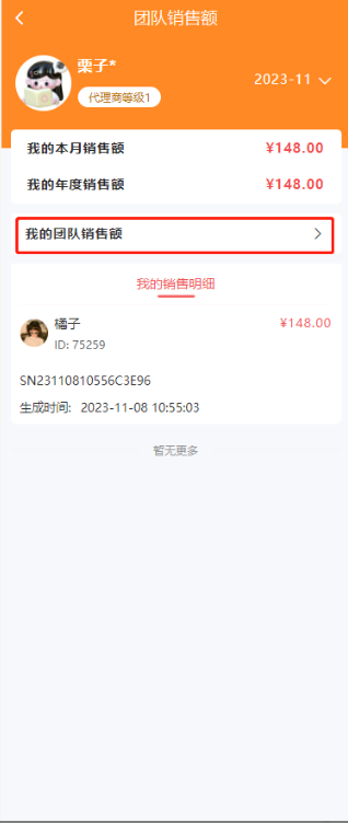 2)点击查看详情,进入查看团队下级和本人的销售额明细。统计销售额为统计当时的实时记录