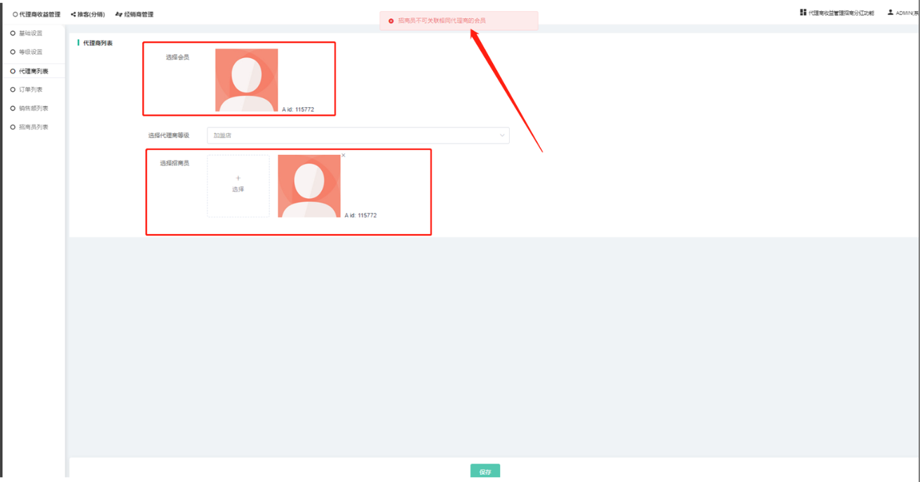 注意:如A是代理商也是招商员身份,A代理商--编辑--绑定招商员时候不支持绑定自己身份的招商员,否则会提示:招商员不可关联相同代理商的会员