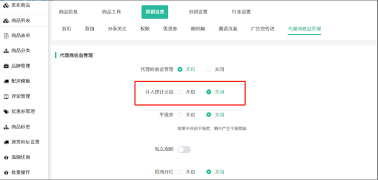 注意:商品--编辑--营销设置--代理商收益管理--关闭计入统计业绩的话,当月累计团队销售额就不统计团队的销售额,自购的销售额会统计。