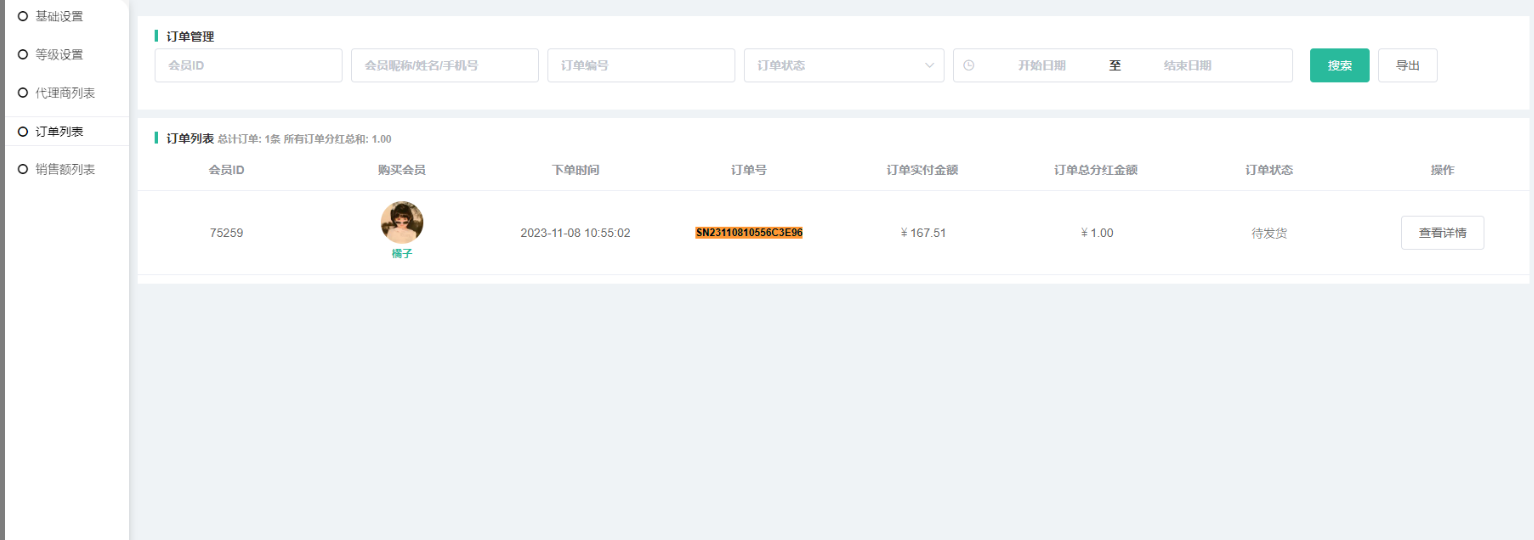 1) 记录每笔订单为哪个会员下单购买,该笔订单总共分红了多少金额