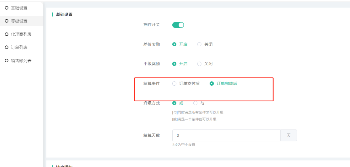 2)平级奖:不开启,该等级不获得平级奖励。开启后设置了百分比,商品编辑里面也设置了独立的平级奖励比例,优先走商品独立设置的平级奖比例。(平级奖的结算随插件基础设置的结算事件和结算天数走)