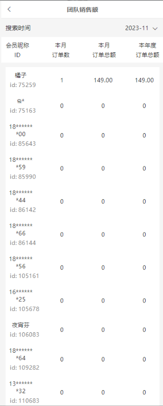 3、团队销售额(会员中心):记录代理商本人:年度销售额,当月销售额,销售额统计明细。可以根据时间筛选变更年度销售额,当月销售额,销售额统计明细