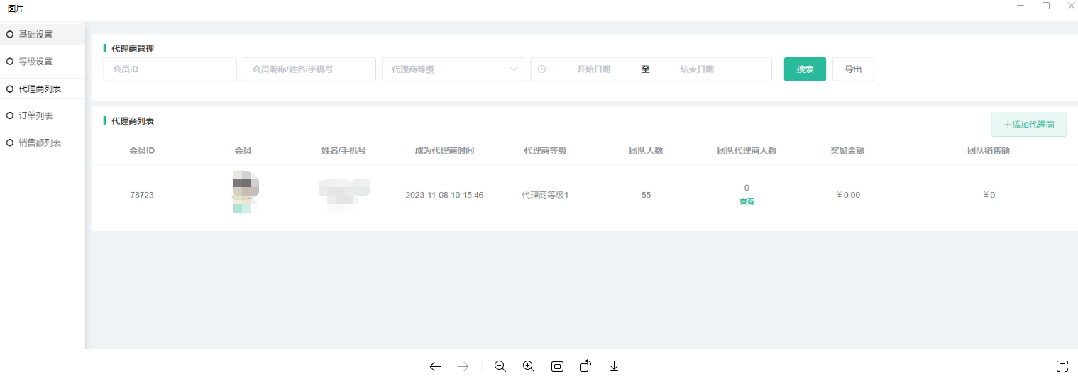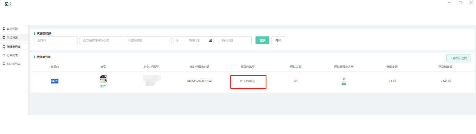 1) 有代理商等级的会员,在此页面可查看到团队人数、团队代理商人数、奖励金额、团队销售额