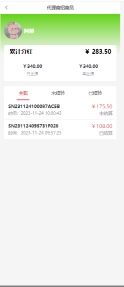 点击进入代理商招商员页面,显示招商累计分红(包含未结算、不包含已失效),月业绩、年业绩,招商分红明细(按订单显示,一笔订单多笔招商分红会累计一起显示)