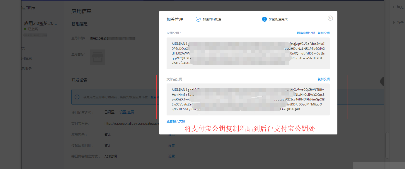 第四步,复制“支付宝公钥”,粘贴到“商城后台--系统--支付方式--支付宝新接口统一配置--支付宝公钥”。
