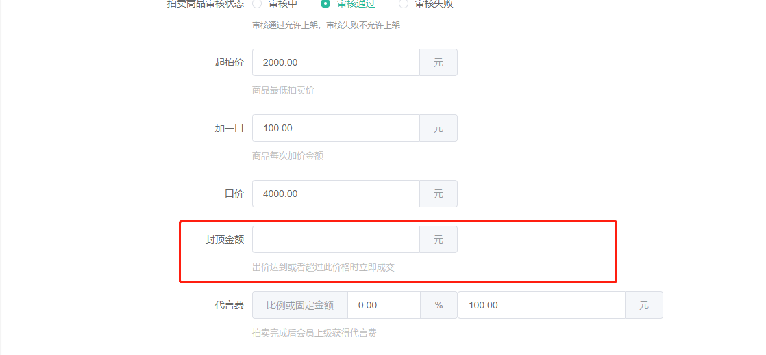 8、代言费,自定义比例或固定金额,竞拍成功的会员上级获得代言费,成交价*自定义比例