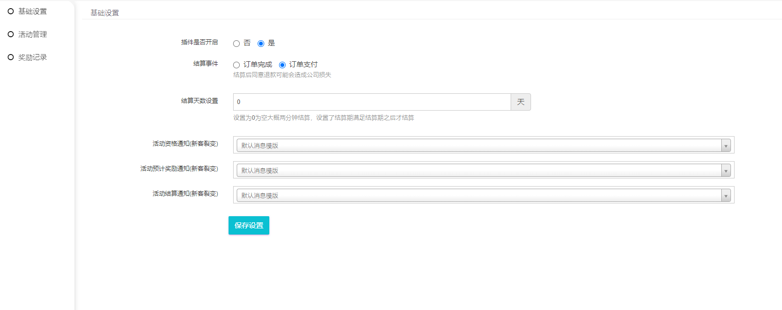 3, 结算天数:根据设置的天数,完成结算事件后进入结算天数,到了结算天数后上级会员才能获得奖励。设置为0为空大概两分钟结算