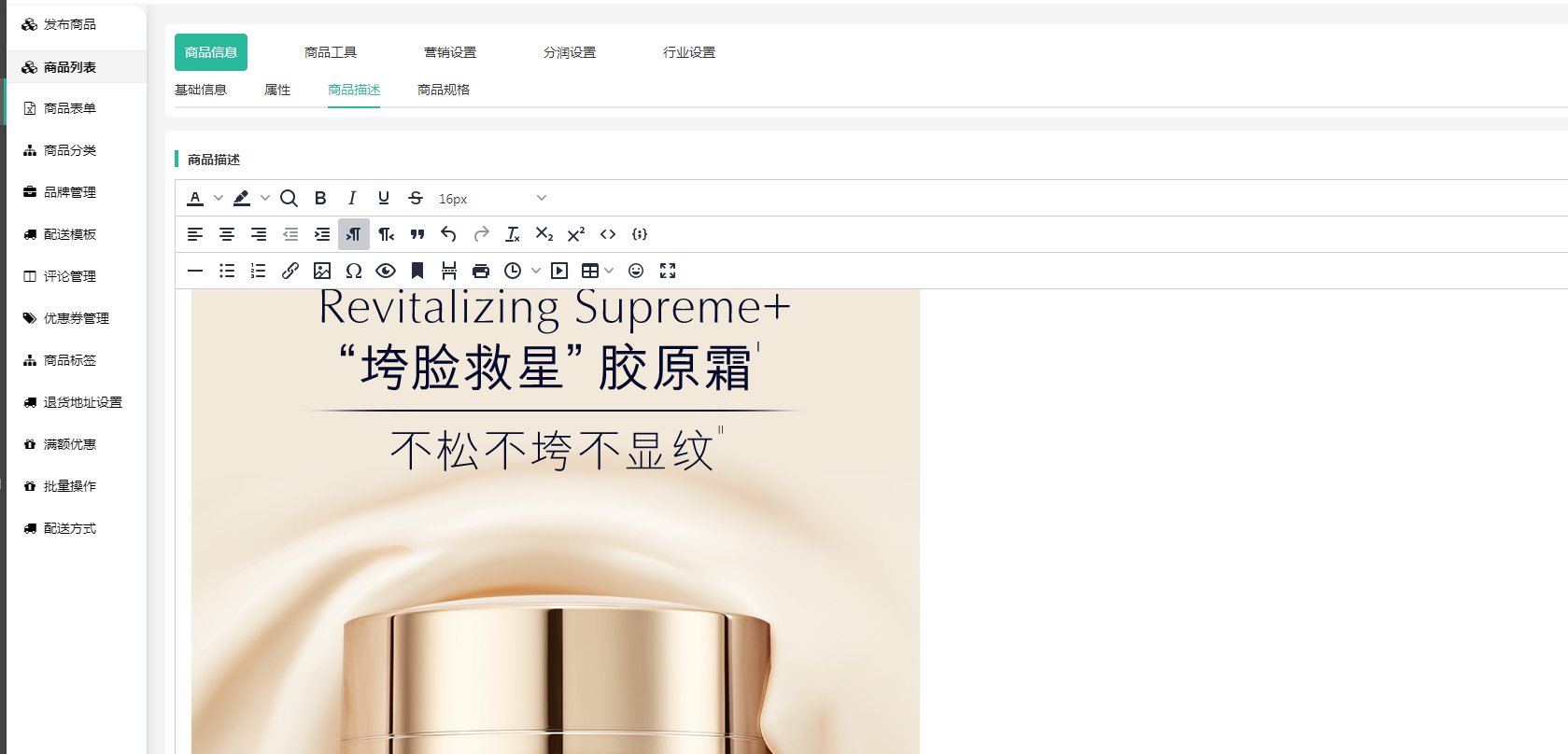 商品详情描述页支持图文编辑框-编辑设计商品详情信息,支持文字、图片。视频等多种形式,是唯一一个向顾客详细介绍宝贝的页面,尽量做到综合全面详细,让顾客清楚地了解商品,激发顾客下单购物乃至多次购物。