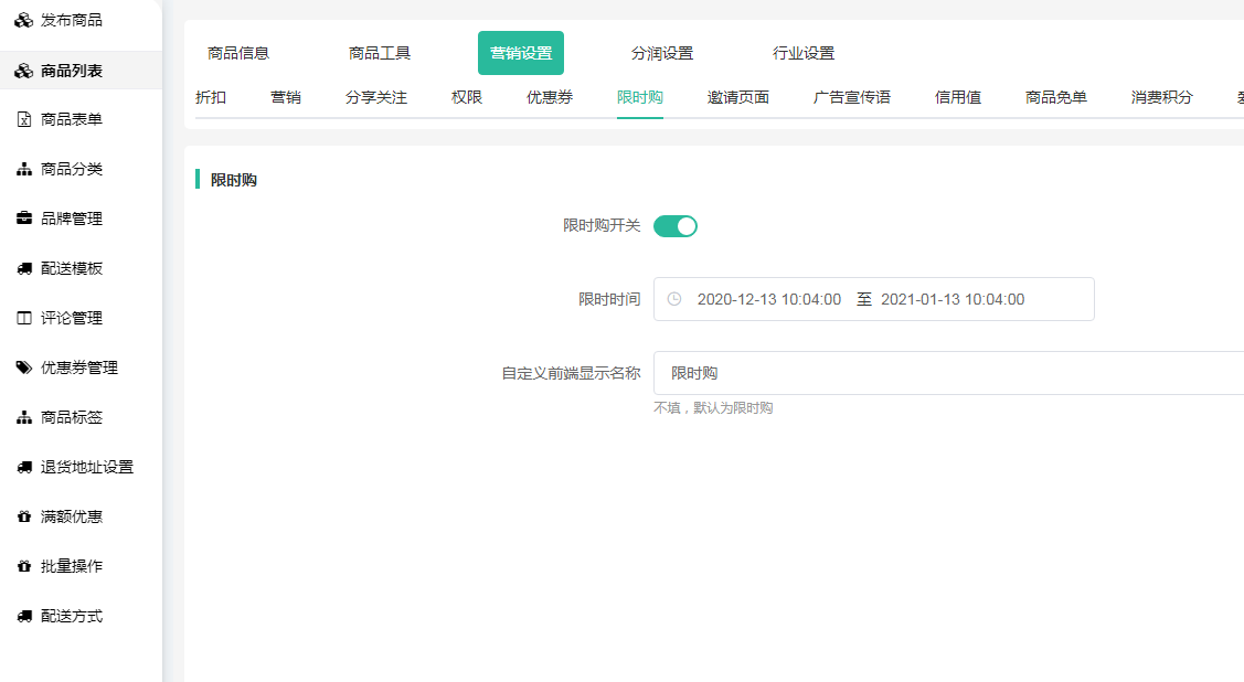 限时购设置商品在指定时间内允许购买,前端商品详情页、店铺装修、默认首页显示限购时间及倒计时。商品编辑限时购:商品上架时可以设置限时购,限时购时间截止后商品就下架处理。