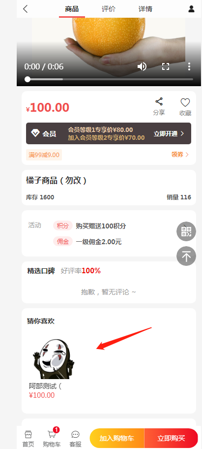 会员等级浏览权限:可以指定特定等级的会员才能浏览商品,非指定等级的会员可以搜索查看,但进入商品详情页提示无权限浏览,默认为全部会员都可浏览。效果如下: