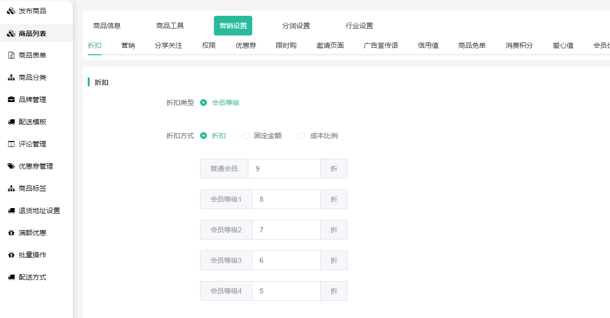 再分为设置每个等级的折扣力度,如选择折扣类型为“折扣”,则如下图: