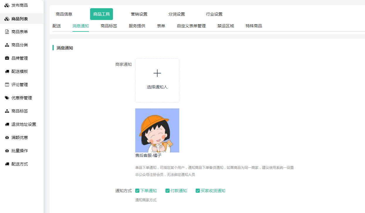 单品下单通知,可指定某个用户,通知方式包括下单通知、付款通知、买家收货通知。