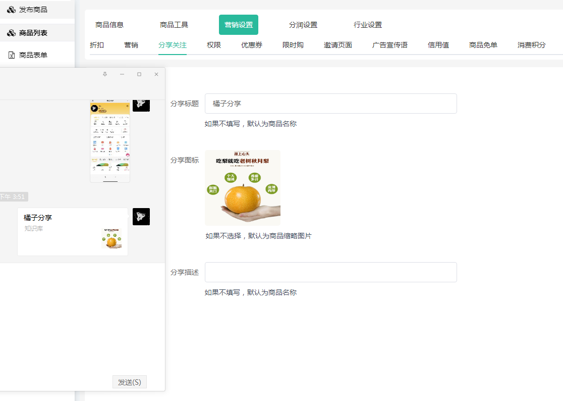 用户分享该商品时显示的分享信息,包括标题、图标、描述。