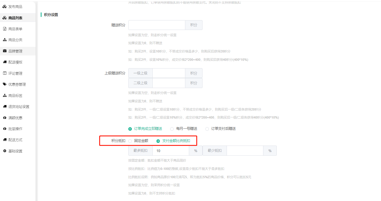 积分抵扣:使用该功能需要在财务--积分管理--基础设置中开启积分抵扣功能,同时主要设置积分与现金抵扣比例。设置用户购买该商品时最多和最少可以使用积分抵扣的金额或者设置积分抵扣比例,如果设置空,则采用积分统一设置(财务--积分管理--基础设置-商品最高抵扣)
