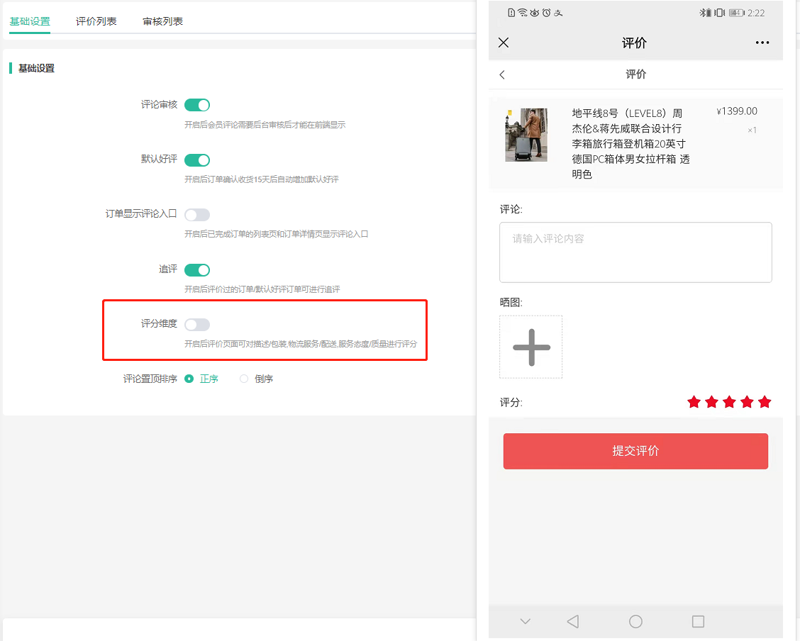 开启后已完成订单的列表页和订单详情页显示评论入口。