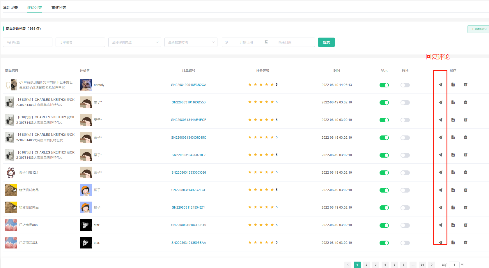 可以对评价进行审核、回复、修改、删除、显示、置顶等操作;