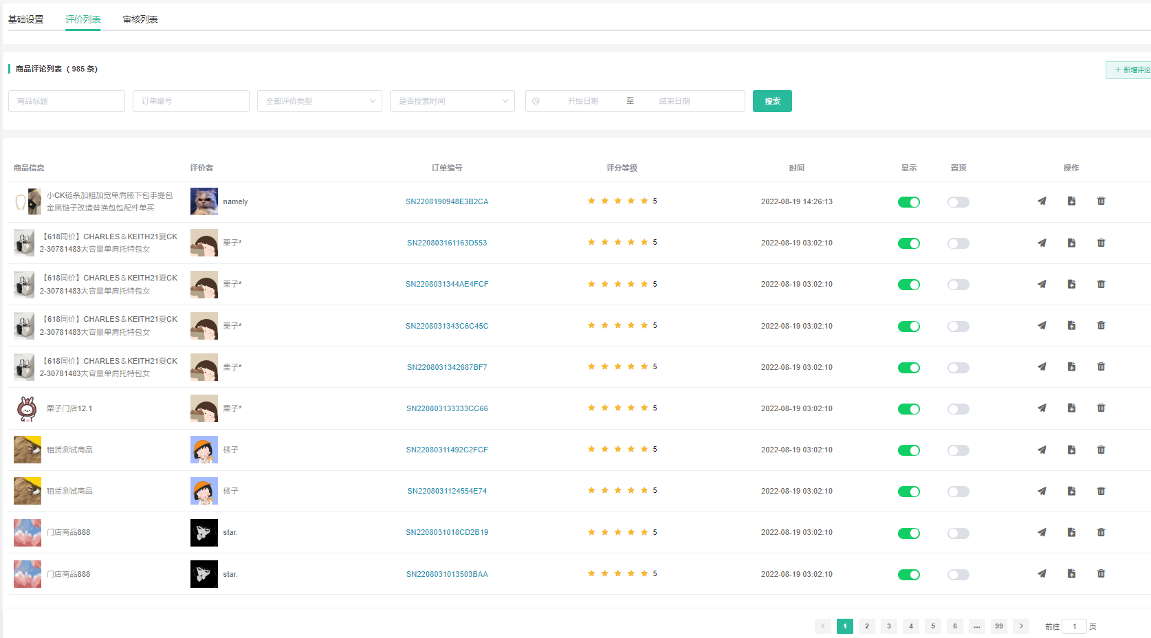 支持查看会员商品评价、是否通过审核、是否显示、是否置顶。