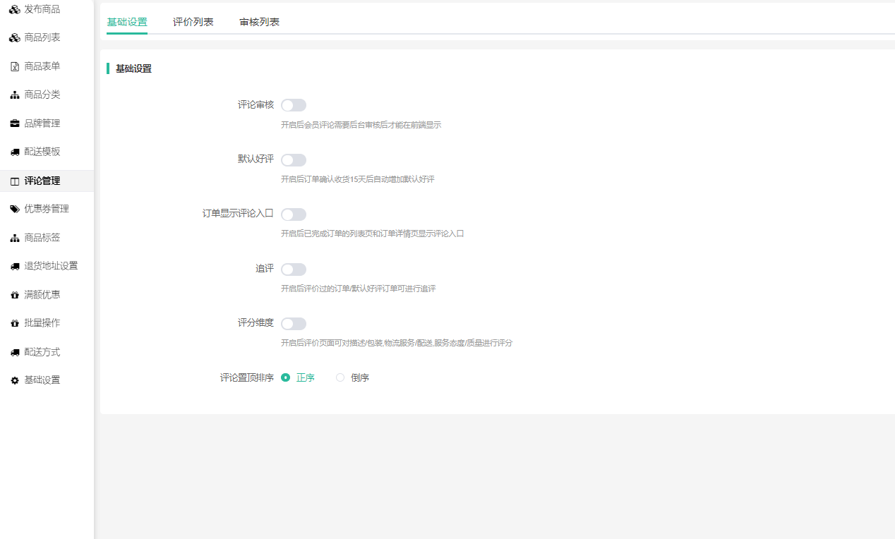 开启后会员评论(首次评价、追评)需要后台审核后才能在前端显示。用户对主评论的回复不用审核,可直接显示。