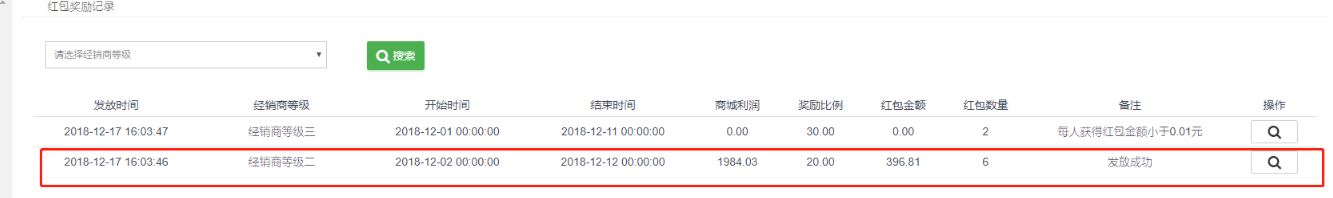 二、举例:经销商等级二设置红包奖励比例为20%,经销商等级二设置的日期为2,12号,22号,则12号发放的红包金额为:团队订单利润(该等级经销商的下级团队订单实付金额-商品成本)1984.03*奖励比例20.00得出奖励金额396.81,红包数量:当前等级经销商人数,当前基金池396.81以发红包的形式随机分给这6个经销商