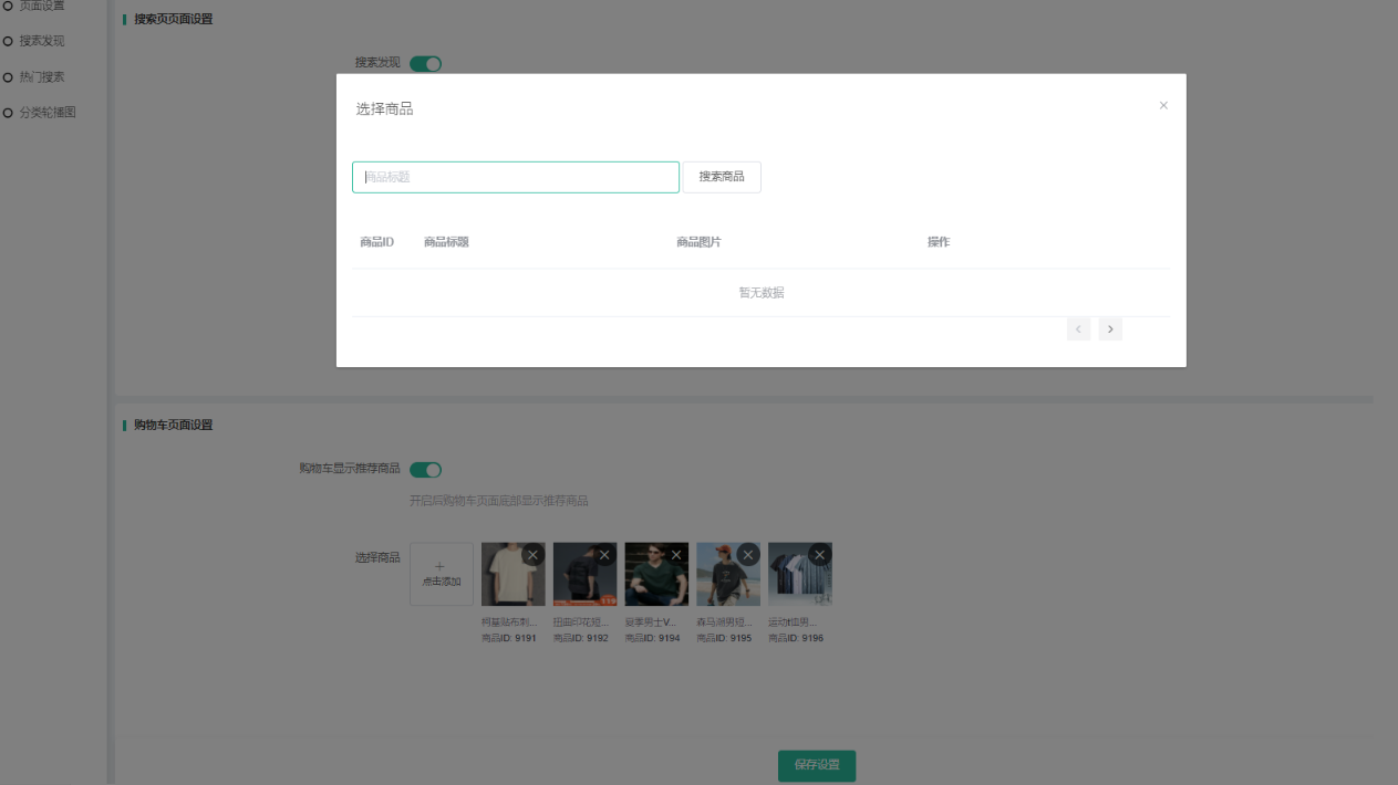 页面设计功能 帮助平台打造人货相遇新触点。搜索页显示搜索发现、热门搜索;分类页显示顶部图片;购物车显示推荐商品。仅支持小程序端。