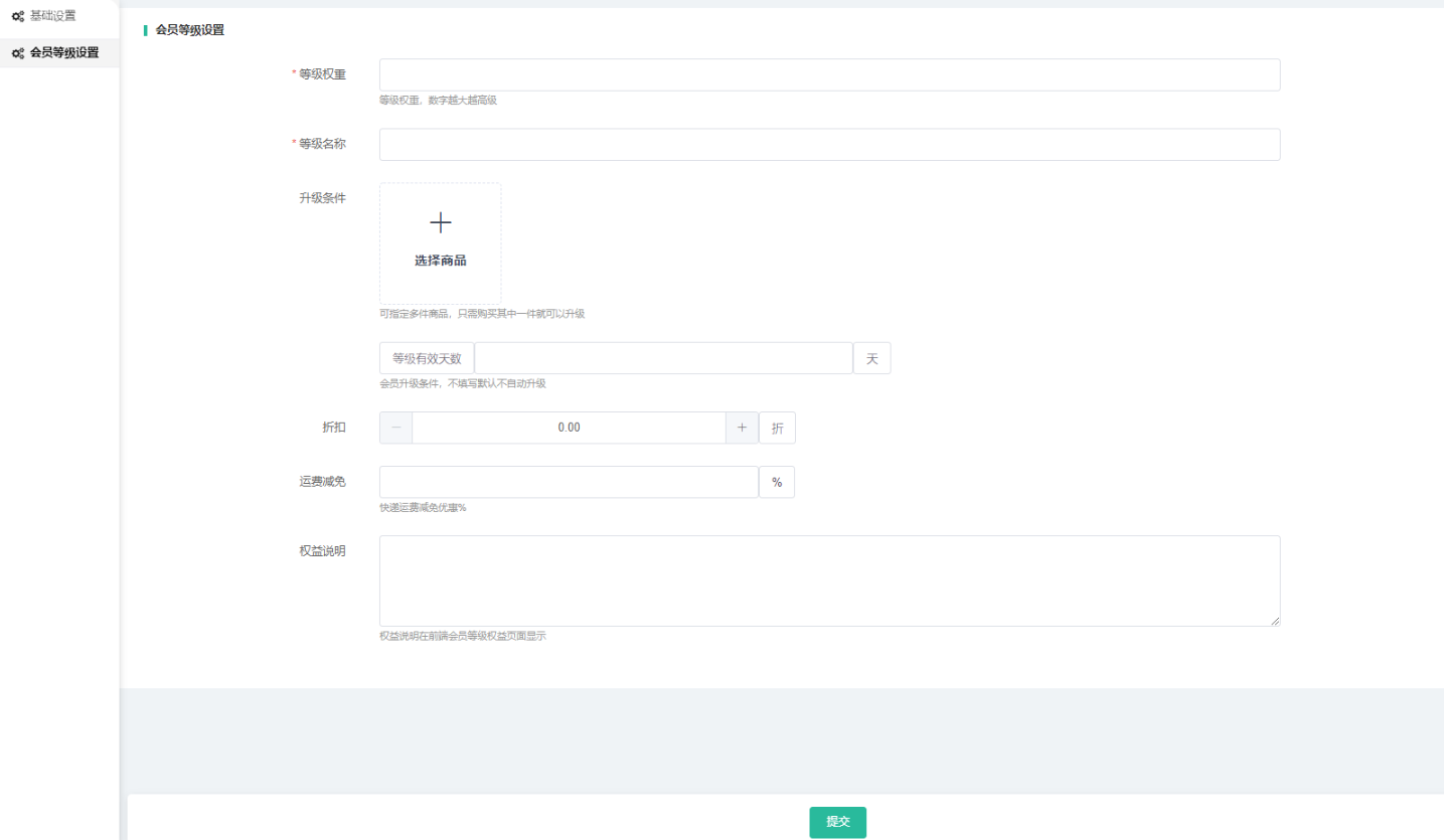 (3)升级条件:会员购买指定商品可升级会员等级。可指定多件商品,只需购买其中一件即刻升级。不填写默认不自动升级。