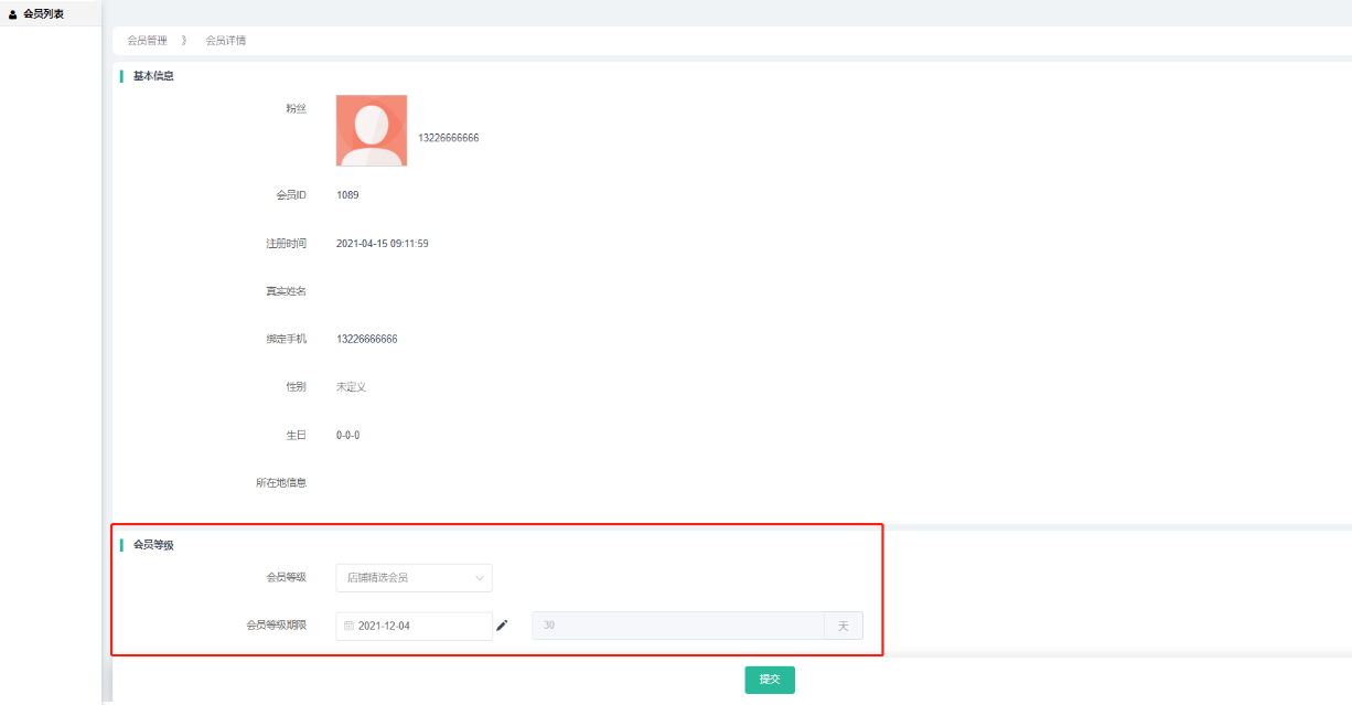(4)等级有效天数:门店会员等级可独自设置,其门下会员按门店会员等级有效天数显示。不受商城平台会员等级有效天数设置影响。如下图。